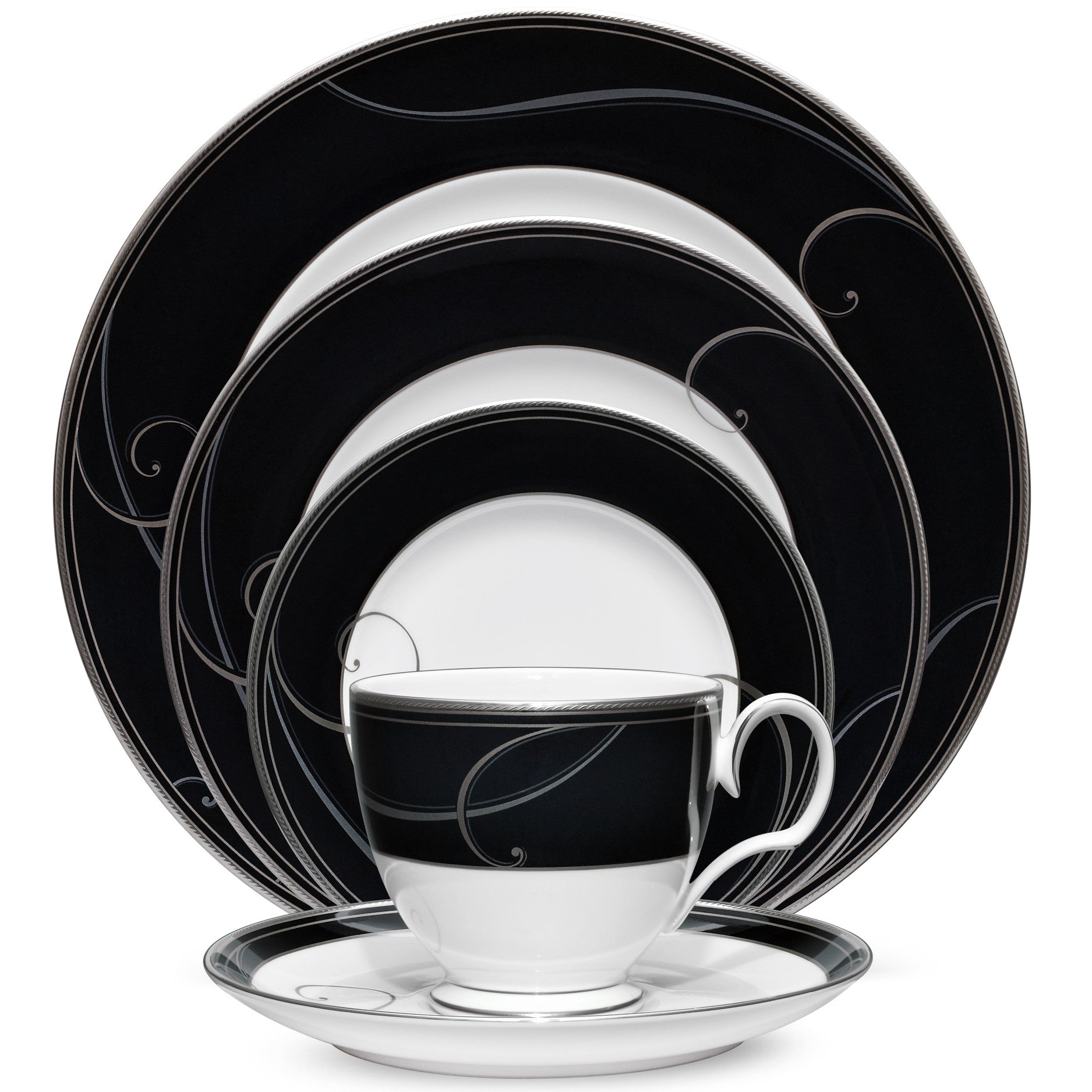 Platinum Wave Ebony offers a stylish and modern twist on formal dinnerware. It features a playful version of a classic scroll design, with bold platinum wave patterns along the rim for an elegant look. Square and round place settings, as well as a large variety of accessories, result in numerous opportunities for personalization and variety on your table. The platinum rim on this pattern means it is not safe for use in the microwave.