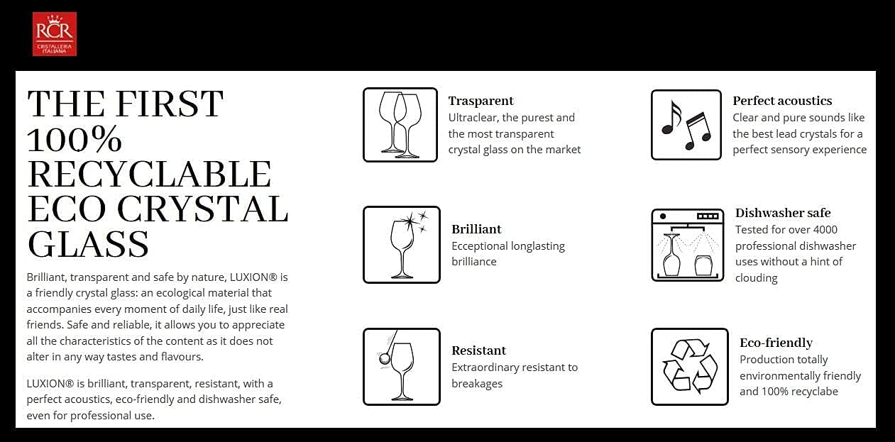 - LUXION® Ultraclear Eco-Crystal: Crafted from the first genuine Eco-Crystal, renowned for its exceptional purity and unparalleled transparency.